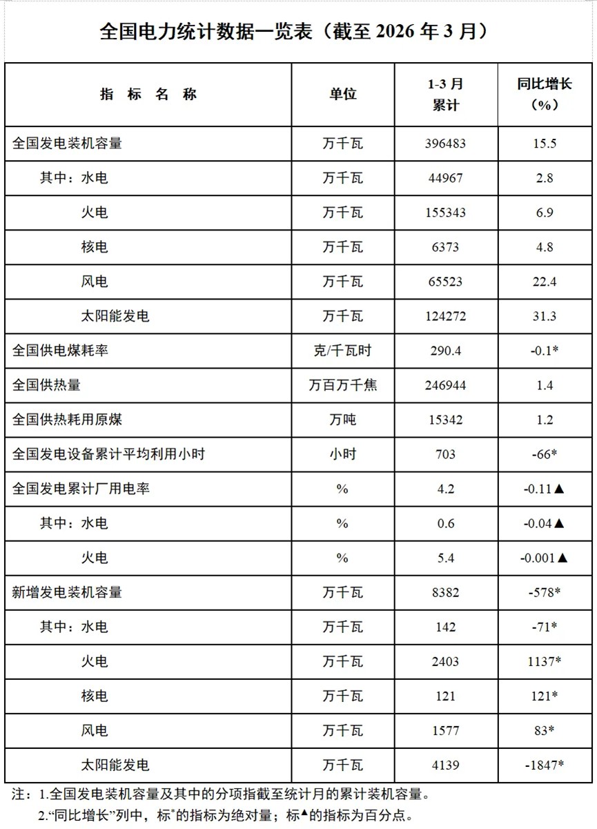(9)2026年4月23日国家能源局发布1~3月份全国电力统计数据