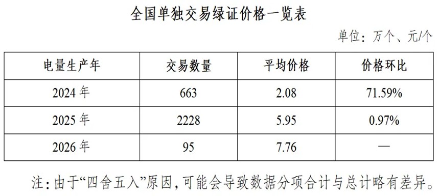 2026年3月,全国单独交易绿证2985万个,其中电量生产年为2024年的绿证交易663万个,平均价格2.08元/个;电量生产年为2025年的绿证交易2228万个,平均价格5.95元/个;电量生产年为2026年的绿证交易95万个,平均价格7.76元/个。
